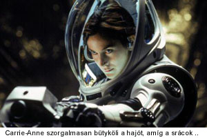 Hangulatos szórakozás azt nézni, ahogyan a srácok helyi készítésű vodkát főznek a hajón, majd amikor a kapitány (Carrie-Anne) megjelenik, egy pillanatra lehet izgulni, hogy lebuktatja őket, de kiderül, hogy ez a Carrie-Anne egy jófej, és ő maga is elkezd velük piálni! Kellemes este bontakozik ki, kártya, vodka meg minden. Val Kilmer pedig már a nap elejétől rá van indulva Carrie-Anne-re, az történt ugyanis, hogy véletlenül megpillantotta őt meztelenül. Fura, amikor mi először láttuk a Halálos Örvény c. B-filmben, a Mátrix előtt, ruhában is teljesen nyilvánvaló volt, hogy ez a lány nem akárki. Erre Val Kilmer a Mátrix után is csak ruha nélkül veszi csak észre, hogy Carrie-Anne nem semmi, pedig amúgy is ő az egyetlen nő az egész hajón. Persze az ember hajlamos lenne simán élvezni ezt a Mars-idillt, hiszen amiből keveset kaptál ki korábban, abból több rosszat is tudsz elviselni, de melletted a csapnivalós lány-fej egy-egy hangos nevetéssel kijózanít.