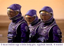Igaz, ami igaz, erre tényleg nehéz mit válaszolni, mindenesetre a film tovább gördül, és a férfiak elkezdenek pánikba esni, mert nem tudnak mivel visszamenni az anyahajóra, és az oxigénkészletük már csak percekre elég. Na mindegy, legalább látunk valami horrort, ahogy kezdenek megfulladni, eléggé izgis. Hogy lehet ebből kimászni? Mármint a forgatókönyvírónak? Hát úgy, hogy az utolsó másodpercben kiderül, hogy mégiscsak van levegő a Marson. Ez a nézőnek kellemes szórakozást nyújt, csak úgy, mint a termetes bárányfelhők, melyeket percekkel korábban már jól megfigyelhettünk a marsi égbolton. De tényleg, oké, hogy egy sivatagban forgatják az egészet, mindenki tudja, de valahogy azért megpróbálhatnák eltüntetni azokat a buta felhőket, ha lehet, mert ez így túlságosan illúzióromboló, legalább is, miután a lány-fej kacagva rámutat, hogy "de jó kis bárányfelhők!".