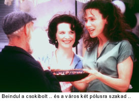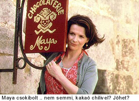 Tulajdonképpen eléggé súlyos dolgokról van szó, mégis megkapóan egyszerű és vidám formában. Amolyan pozitív film, csalódás nélkül. Az pedig, hogy az egész konfliktus, meg harc, meg minden arról szól, hogy egy közösség hogyan viszonyul a csokihoz, egészen figyelemreméltó dolog, színtiszta gyakorlati filozófia. Olyan az egész, mint egy Lafontaine mese, csak nem tücsök és hangya, hanem Binoche és Carrie-Anne. Kellemes, de tényleg, és roppant tanulságos is, mert segít megismerni önmagad, már csak azzal is, hogy a csoki és a böjt közötti szakaszon, vagyis a jobb és a baloldal, a mínusz és a plusz végtelen között elhelyezheted magad, mintha egy tesztet töltöttél volna ki.
