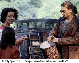 A helyi kocsma tulajának felesége is ott köt ki, mert elmenekül, nem tud hova menni. A kezdetben zavart és kleptomániás nő percek alatt kikupálódik, ami persze a grófot arra sarkallja, hogy ő is ugyanezt megtegye a férjjel. A másik alap csoki-csapat tag Armande (Judy Dench), Carrie-Anne Moss anyukája, aki nem láthatja az unokáját. Vianne természetesen megszervezi, hogy az unoka kisfiú és a nagyi rendszeresen találkozhassanak. És ha ez még nem lenne elég a két ellentétes bolygó harcának felvonultatásához, a város szélén vízi vándorok jelennek meg, folyami cigányok, élükön Johnny Depp-pel.