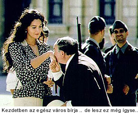 van férje, csak a fronton van, és tulajdonképpen meg is halt. Szóval ez a történet, illetve, amit történet helyett kapunk, hiszen ez csak egy állapot, egy helyzet, amibe be kellene, hogy csapjon (végre) a konfliktus, ami történetet csinál az alapszituból. Ez nem fog megtörténni, mindvégig be kell érnünk azzal, hogy Renato követi a nőt, szerelmes belé, ja, és álmodozik róla.