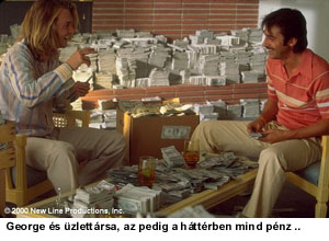 legyünk naivak, mert a szolgáltatói oldalról nézve a fű is drog, mivel jó sok pénzt lehet keresni vele (illetve az állam szempontjából: veszíteni). George Jung és kis csapata percek alatt eljut oda, hogy heti két óriási bőrönddel csempésznek át a keleti partra marijuana-t. A sok egyetemista azonban túl jó felvevő piac, és ez a két bőrönd kevésnek bizonyul. Alig markolunk kettőt a hizlalós popcornunkból, és Jungék lementek Mexikóba saját "forrást" találni, sőt, megszervezték a kis motoros repülővel történő szállítást is. Elképesztő mennyiségű pénzük lett. 100 ezer dollárok hetente! Ezt látva egyébként nem is annyira meglepő, hogy az ártatlan szórakozást kábítószernek nevezik, ugyanakkor vicces belegondolni abba is, hogy ha ezt a forgalmat megadóztatnák, mennyivel jobban járna mindenki, na nem mintha az alvilág sorban állna azért, hogy végre adózhasson a drogokért. Na jó, félre a tréfával, Jung és tsai nagyon-nagyon sok pénzt keresnek, és a film már itt kőkemény tanulságot kínál nekünk, mert ez az, amiért az egészet csinálták, a pénz, és ez az, ami, rögtön, ahogy megszerzik, mint egy lendkerék, továbblendíti őket az úton, felfelé az anyagi létrán, és meredeken lefelé a fű-lejtőn. Vagyis látjuk, hogy a dolgok nem a véletlen szeszélyéből alakulnak úgy, ahogy, hanem mint ahogyan egy tű szántja szorgalmasan egy bakelit lemez barázdáit, ugyanúgy egy lefixált útvonalat követnek a srácok a korong közepe felé, és ez nem kis élmény -mármint mindezt látni.