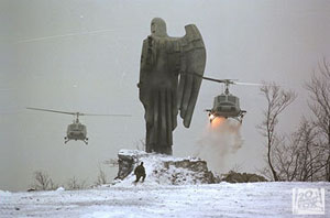 Amúgy tényleg normálisan "járnak el az ügyben", szépek a képek, Owen Wilson pedig annyit fut, amennyit talán még senki soha (legalább is idén) a vásznon. A legszebb rész, ami miatt valószínűleg a forgatókönyvet is megvették az, amikor a két pilóta megérkezik egy hegy tetejére, amin egy hatalmas szobor áll, egy angyal szobra (mint amilyen a Kis Szemtanúban is van az állomáson). Havas hegytető, egy lapos terület, pont mint ami Citadellánk a szabi-szoborral, az ember szívében melegség ébred: "civilizáció!", azaz "Owen Wilson megmenekült". Ám ahogyan az ejtőernyőjével egyre lejjebb és lejjebb ereszkedik, és végül az angyal arca előtt ereszkedik, jókora horror-kép fogad minket: az angyal halott, teljesen szétlőtték az arcát. Ez egy nagyon szépen és jól elkövetett