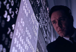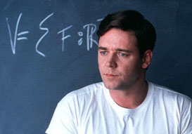 retardált gyerek filmekből ismert mozdulatait keverte volna össze), de még ez sem tudta felülmúlni annak a mulatságosságát, ahogyan a 38 éves Crowe próbálta eljátszani a 19 éves Nasht. Nem kellett volna ilyen helyzetbe hozni a Gladiátort, mert amellett, hogy kitűnő színész, és szinte mindent el tud játszani, a kamaszfiúság egyszerűen nem illik hozzá, ahogy ez tisztán ki is tűnt az első jelenetekből. De ezzel még nem jutottunk túl Crowe és a film problémáin, mert hiába nő fel hamar az ifjú Nash, a cselekmény nem várt fordulatai ismét lehangolnak minket. Nash Princetonban nem jár be az előadásokra, mert valami eredeti felfedezésre tartogatja az erejét, és már éppen veszélybe kerülne a további karrierje, amikor egy esti bulizás során meglepő közgazdasági felfedezést tesz a játékelmélet területén. Ennek a bemutatása is igencsak erőltetett a filmben: látunk egy szőke lányt és három barnahajú barátnőt körülötte, és a fikció az, hogy négy fiú - köztük Nash - versenyt indít a szőke lány megszerzésére.