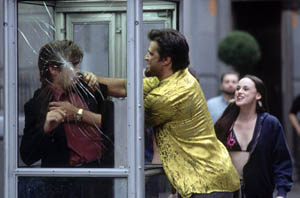 Aztán lassan közeledünk filmünk egyetlen helyszínéhez, "a telefonfülkéhez", amihez a következő másfél órában hozzá leszünk bilincselve mi, nézők, illetve Stu haverunk is. A fülkében megcsörren a telefon, Stu felveszi, mi pedig egy, "az Úr hangja"-típusú öblös és idegesítő férfihangot hallunk. Ő lesz a Hívó, aki azzal szórakozik, hogy céllövő puskájával vadidegeneket terít le, de előtte még megtud róluk egy-s-mást, felhívja őket a fülkében, alázza őket telefonon, aztán miután távolról lepuffantotta az alanyait, szépen eloldalog a tett helyszínéről. Nagyon vicces történet, de sajnos, az élet is produkált hasonlót (Washington DC-ben egy ámokfutó orvlövész tavaly 11 embert ölt meg), úgyhogy emiatt veszélybe is került a film fogadtatása, és a producerek 5 hónappal kitolták a bemutató időpontját.