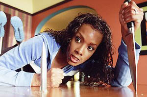 véresen hever a földön, összeverve, és még fejbe is lövik (Tarantino nyilván keményen akart indítani, hogy kivívja a tiszteletet), csakhamar rátérünk a film legjobb jelenetére, amely öt perc izgalmas folt a mozitörténélem égboltján, mert ez Tarantino nagy visszatérése. Uma Thruman egy rózsaszínű "pussy wagen" furgonnal leparkol egy békés családi ház előtt, befelé menet, az udvaron széthagyott színes gyerekjátékok övezik az útját, odabent pedig egy barátságos fekete családanya fogadja. Ő az egyik személy azok közül, akik megölték őt, és a magzatát az esküvőjén. Uma Thurman karaktere viszont nem halt meg, csak négy évnyi kómába esett, és most visszatért, hogy leszámoljon a gyilkosaival, szépen, sorban. A fekete csajjal nagyon kemény harcba kezdenek, a végén már késekkel, életre, halálra. Ekkor hazajön a kislánya az isiből, és percekre mindketten leteszik a fegyvert. Ez az egész jelenet Tarantino visszatérésének újszerű töltésétől vibrál, úgy is érezzük magunkat, hogy "lám, mégiscsak jó lesz ez a film, hurrá !", de örömünk túl korai volt, csak ezt ekkor ezt még nem tudtuk.