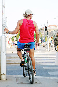 követünk a budai rakparton, és közben azt figyeljük, hogyan viselkedik, milyen helyzetekben miféle döntéseket hoz. Kísérletünk alanya átlagos moutainbike-os, (MTB-s), bár jellemző módon az ülése eléggé alacsonyan van (ami nem vall profizmusra), plusz a kormányán egy hatalmas rózsaszín duda éktelenkedik, amit enyhén pocakos alanyunk olyan élvezettel használ, mintha éppen 6 hónapos lenne, és még nem tudna beszélni.