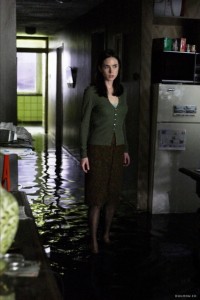 Amikor a nő leugrik az alagsorba, hogy kimossa a ruháit - mintha csak épp a napfényes Kaliforniában lenne, vagy egyenesen a Merlose Place-ben, akkor kissé kezd a film erőltetetté válni. Olyan sötét nyomortanyára költözött be, ahonnan a KÖJÁL 1 perc alatt kilakoltatná, folyamatosan ömlik a víz (a fekete víz) a plafonból, a felette lévő lakásban pedig nem kevesebb, mint térdig áll a víz (a fekete víz), de ő, mintha mi sem történt volna, lesétál az alagsorba (!) a szennyessel, hogy kimossa. Amikor a gép elnyeli az egyik pénzét, simán átrakja az egészet a másik lepukkadt mosógépbe, hátha az majd működik. A rovarok agyánál kevésbé fejlett filmzene itt már gazdagon terít mindenféle hátborzongató üveghangokkal, visszafelé elsütött vonósokkal, úgyhogy, amikor a nő megpillant egy mosógépben forgolódó kislányt, mi már kábé csak annyit reagálunk, hogy "jé, tényleg, ott is lakik valaki?".