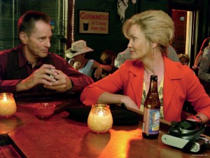 mlékeztet minket a Jarmusch-féle Broken Flowers-re, bár azt egyáltalán nem gondoljuk, hogy Wenders bármilyen formában nyúlt volna Jarmusch-tól, a két filmet majdnem egy időben kezdték el forgatni, meg Wenders amúgysem szorul rá ilyesféle sztori-kölcsönzésre). Nem örülünk, amikor kiderül, hogy ez az a kisváros, ahol Howard karrierje elindult, hogy itt forgatták az első westernt, ami sztárrá tette őt. Annak sem örülünk, hogy ez a 20 évvel ezelőtti forgatás az egész városka életét meghatározta, egyrészt mert ez túl snassz, másrészt mert ilyen filmet már láttunk, és az nem is volt rossz (A Múlt Árnyékában volt a címe, és Virginia Madsen volt benne a kisvárosi nőszemély, bár ott a forgatás jelen időben zajlott).