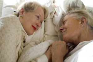 Az öregség legkegyetlenebb, szinte paparazzói, kukkolói megnyilvánulása volt, amikor Meryl Streep arcát és szemeit olyan közeliben mutatták, hogy egy mikroszkóp már csak annyira jött volna jól, mint esõ után egy köpönyeg. Oké, látjuk, hogy a gyönyörû színésznõ, aki évtizedeken keresztül jobb és jobb filmekben, gyönyörûbbnél gyönyörûbb alakításokat produkált, most már 57-58 évesen rendelkezik némi ránccal az arcán és a szemei körül (ezzel együtt, tuti, hogy rásegítettek a maszkosok is némi öregítéssel). Ezt azonban csak akkor vágjuk be, ha