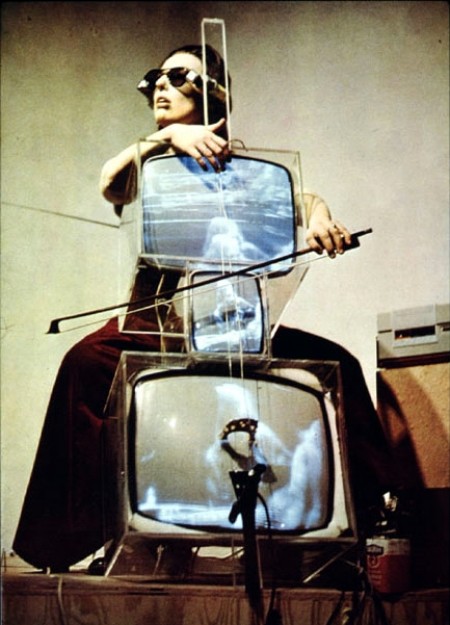 fotó - Nam June Paik, t.v. cello, Charlotte Moorman-nel 1971