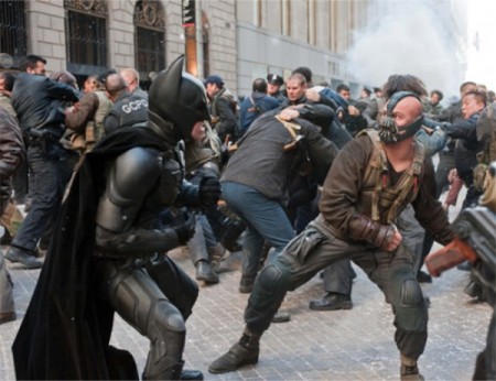 Ez a forradalom persze nem egy igazi forradalom, hanem csupán a káosz elszabadítása a városban, ahol a főgonosz Bane nagyban ugyanazt csinálja, mint amikor terroristaként megtámad egy értéktőzsdét, beront, lelő egy-két embert, megüt másik kettőt, a levegőbe lő, sugárzik belőle az erőszak és a könnyed gyilkolási hajlandóság, és onnantól kezdve övé a hatalom. Bár nem hangzik el a „forradalom” kifejezés a filmben (viharként emlegetik), azt látjuk, hogy miután Bane megöl jó pár New York-it, a többieket arra buzdítja, hogy kb. vegyék el azt, ami jár nekik, ami úgy néz ki, hogy a csőcselékké vált polgárok megtámadják a gazdagok szállodáit, törnek-zúznak, és egy rögtönítélő bíróság (aminek az élén az első film főgonosza, Cillian Murphy áll) halálra ítél embereket, nem tudni, mi alapján. Bár valószínűleg ezzel a „forradalmi mondanivalóval” több értelmezési/befogadási keretet kívánt Nolan és csapata beizzítani (kvázi nemcsak az akciófilmek és katasztrófafilmek nézőit megnyerni a filmnek), nem jött be ez a szándék, csak az amúgyis folyton jelenlevő erőszak továbbterjedéseként vettük ezt a fajta Gotham-forradalmat.