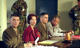 Tehát "egy gyenge nő a tapasztalt, hűvös férfiak között"- típusú konfliktust látunk, amit a történet egy eléggé elcsépelt motívummal old fel, vagyis behoz egy idős, kipróbált katonai jogászt (Morgan Freeman) a képbe, aki régen sztárügyvéd volt, de az idők során alkoholistává vált, és most fülbevalóval és motorral felszerelkezve tengeti a napjait, mindaddig, míg meg nem találja az ügyvédnő, illetve vele együtt a nagy kihívás. Az egész film hajlamos az ehhez hasonló bevált, sok más filmben látott megoldások alkalmazására, ami miatt gyakran van olyan érzésünk, mintha már legalább egy ilyen történetet láttunk volna ezelőtt. Ha egy-az-egyben nem is, de elemeiben bizony ismerős sztorival állunk szemben. Adva van egy boldog házaspár, akinek az élete egy pillanat alatt törik szét darabjaira (erre emlékeztetően említhetjük a Szökevényt, vagy legutóbb a Megszólít az Éjszaka című Richard Gere-filmet), a férfi múltjából sötét titkok tudódnak ki (minden harmadik B-kategóriás amerikai filmben ez történik), a hősnő